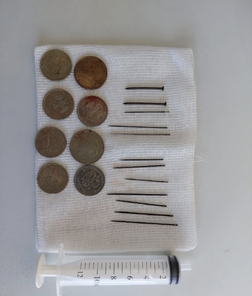 Тут же была назначена операция, в ходе которой хирурги вытащили - десять иголок, восемь монет и два гвоздя.