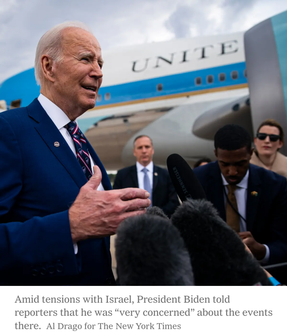 "Они не могут продолжать идти по этому пути - я вроде как ясно дал это понять", - сказал г-н Байден. "Надеюсь, премьер-министр будет действовать таким образом, чтобы попытаться выработать какой-то подлинный компромисс, но это еще предстоит увидеть".