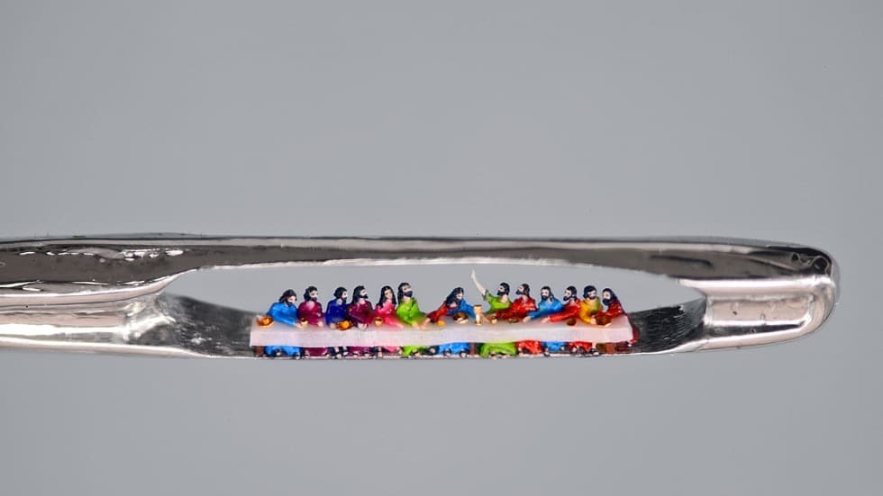 Среди выставленных миниатюрных шедевров - изображение Иисуса и 12 апостолов во время библейской сцены "Тайная вечеря", скульптуры Уильяма Шекспира и Альберта Эйнштейна, вымышленных персонажей Пиноккио и Робин Гуда, а также воссоздание картины знаменитого голландского художника Йоханнеса Вермеера "Девушка с жемчужной сережкой".