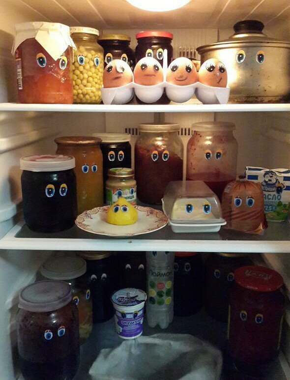 7. Ночью, пока все спят, приклейте ко всей еде в холодильнике глаза. Представьте: встаёшь, ещё сонный идёшь к холодильнику, а там… :)