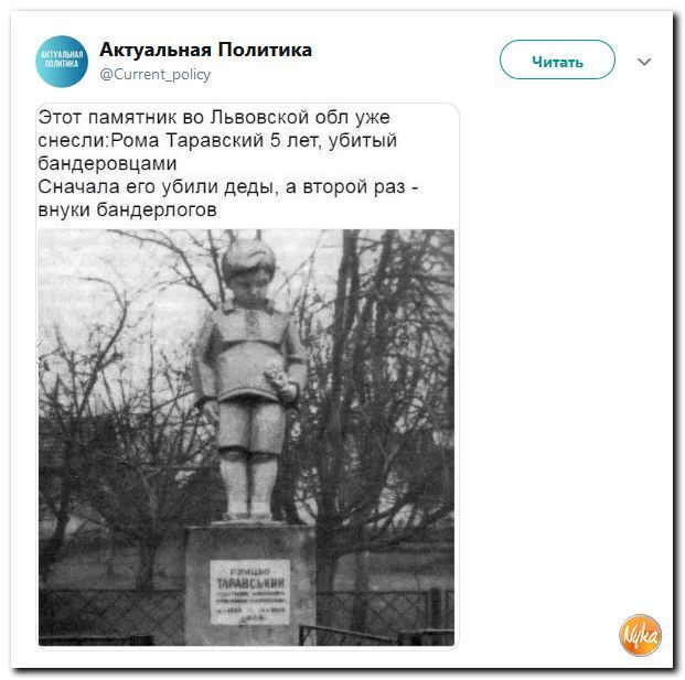 Пятилетнего Рому Тарнавского бандеровцы зарезали в октябре 1951 года только за то, что он пел на сельской улице о краснозвездных бойцах-освободителях. А спустя десятки лет необандеровцы убили мальчика еще раз, глумливо разрушив на Львовщине поставленный ему памятник. (Памятник Роме был снесен 1 июня 2015г. в День защиты детей)