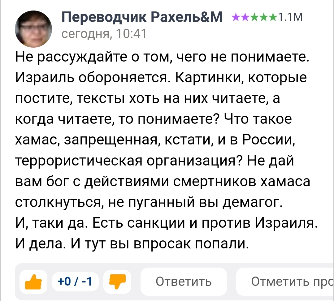 Ответ пользователю Переводчик Рахель&М на тему Израиля и Хамас