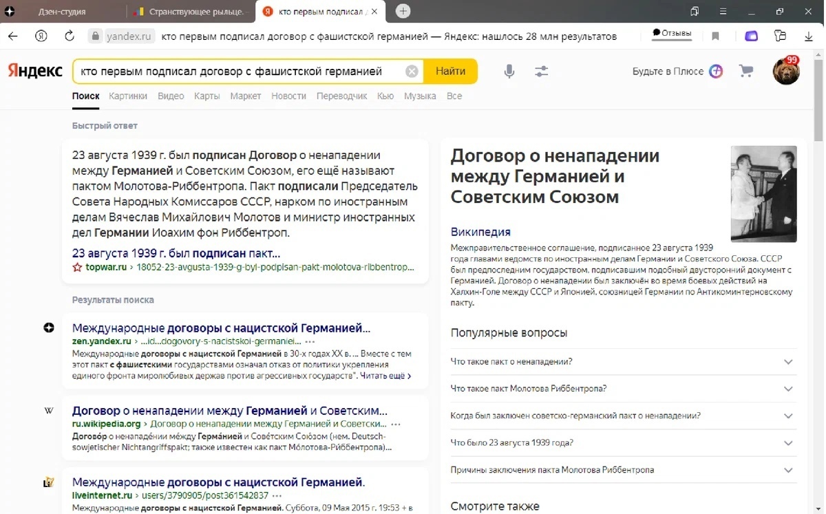 Набираешь в поисковике: "Кто первым подписал договор с фашистской Германией?". Ответ с первых строк; Пакт Молотова-Риббентропа...