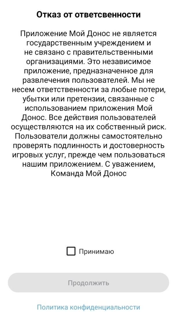 В начале апреля в интернете стала активно распространяться инфомация о том, что появилось приложение "Мой Донос", где каждый желающий может так сказать на ближнего своего и не только известную ему информацию анонимно. Как потом оказалось, что данное приложение шуточное и к России и спецслужбам никакого отношения не имеет, хотя распространялась информация в этом ключе. Специально зашёл на Гугл Плей посмотреть сие шуточное приложение. По оформлению напоминает "Госуслуги", кто-то сильно постарался. Я даже скачал, но не стал принимать условия, так как там отказ от ответственности.