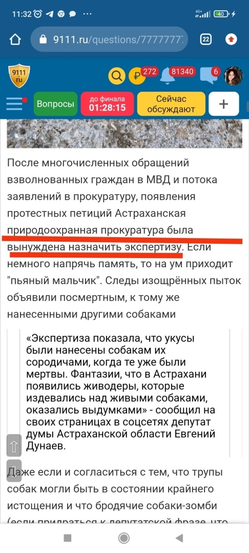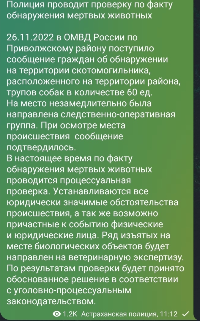 После многочисленных обращений взволнованных граждан в МВД и потока заявлений в прокуратуру, появления протестных петиций Астраханская природоохранная прокуратура была вынуждена назначить экспертизу. Если немного напрячь память, то на ум приходит "пьяный мальчик". Следы изощрённых пыток объявили посмертным, к тому же нанесенными другими собаками