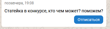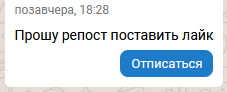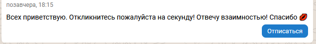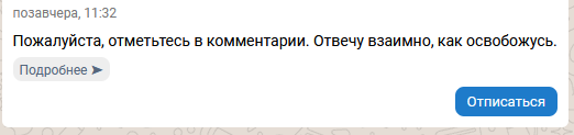 Доброго времени суток) Пожалуйста оставьте отзыв на статью Подробнее ➤ Если вы сочтете возможным еще поставить лайк будет вообще замечательно) В ответ присылайте сообщением ссылку на статью, видео или опрос, обязательно отвечу лайком комментарием. Спасибо, что потратили время на прочтение моей просьбы, добра и хорошего настроения) . Прошло более недели, я думаю раз человек не ответил, не буду ему докучать, а мне приходит ссылка на статью где этот человек обсуждает некорректность поведения, при этом не следя за собой. Ну и ка тут реагировать по вашему мнению?) Забыл добавить в то время оба были подписаны друг на друга.