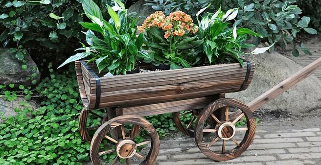 Часто в хозяйстве остаются ненужные инструменты и средства для транспортировки мусора. Один из них — трехколесная тачка, которая может стать оригинальной клумбой в середине газона. Соорудить такую конструкцию несложно. Неплохо в ней будут смотреться плетущиеся многолетники, полевая ромашка и плющ.