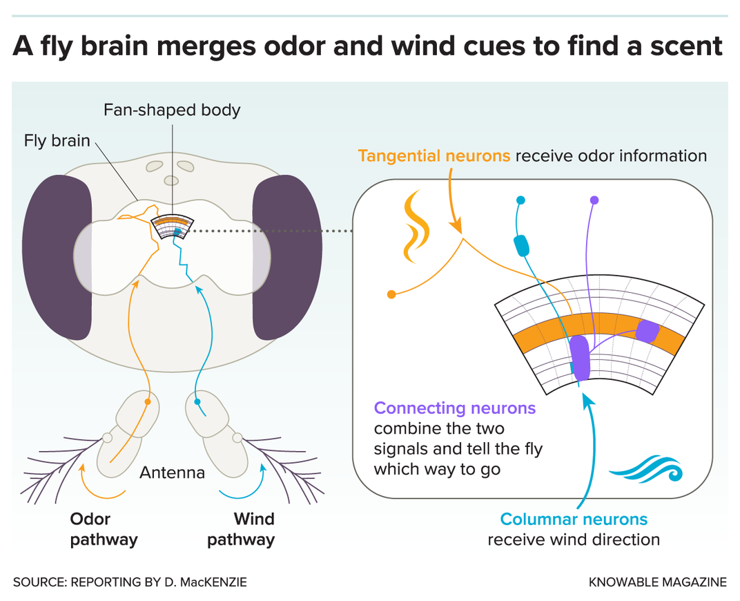 На самом деле мухи обрабатывают поступающую сенсорную информацию чрезвычайно изощренным способом. В ветреную погоду направление движения мухи на самом деле является комбинацией двух различных направлений: направления воздушного потока и среднего направления движения пакетов с запахом. Используя коннектом мухи, Нагель точно определил одно из мест в мозгу, где должна происходить эта обработка . Нейроны мухи, чувствительные к ветру, перекрещиваются с обонятельными нейронами, чувствительными к направлению, в определенном месте мозга, которое описательно называется «веерообразным телом». Вместе два набора нейронов сообщают мухе, в каком направлении двигаться.