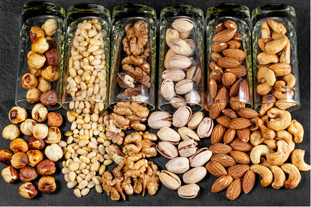 Орехи содержат мононенасыщенные жирные кислоты, которые способствуют снижению уровня холестерина в крови и укрепляют сердце. Они содержатся в грецких орехах, миндалях, кешью и других продуктах.