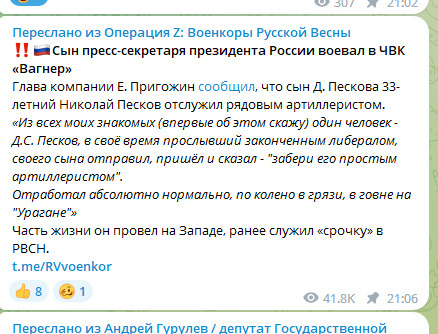 Уже всем Пригожин сказал, что сын Пескова у него воевал. Надоели провокаторы.....