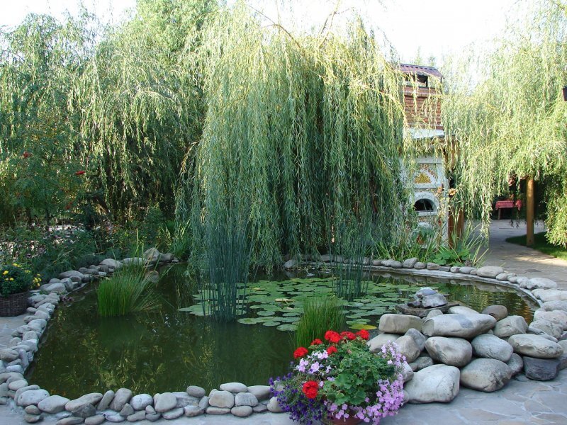 Вот то, чем мы всегда восхищаемся , - пруд с фонтанчиком. В жару, так приятно посидеть рядом и послушать шум бегущей воды, а над тобой развесив красивые ветви, возвышается красивейшее дерево, - ива.