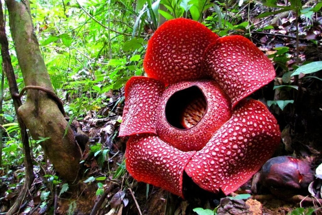 Цветок Раффлезии Арнольди не имеет стебля, листьев и корней, и полностью паразитирует на растениях рода Tetrastigma. Он вырастает из подземного корня и раскрывается только на короткий период времени, обычно на несколько дней. Цветок имеет ярко-красный цвет и излучает запах, напоминающий гниющее мясо, чтобы привлечь насекомых-опылителей.