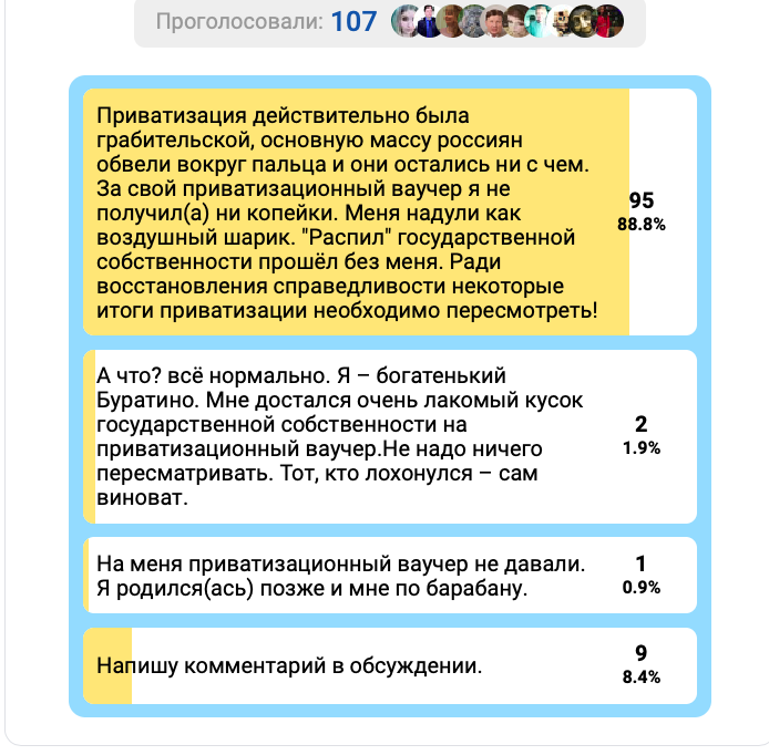 Ради интереса 19 апреля текущего года мною был опубликован опрос, касающийся приватизации 90-х. Вот результаты опроса на утро сегодняшнего дня.