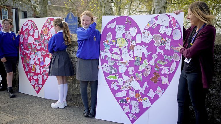 Ученики начальной школы Алдингтона показали коллаж из рисунков собак, которые они нарисовали внутри большого сердца.