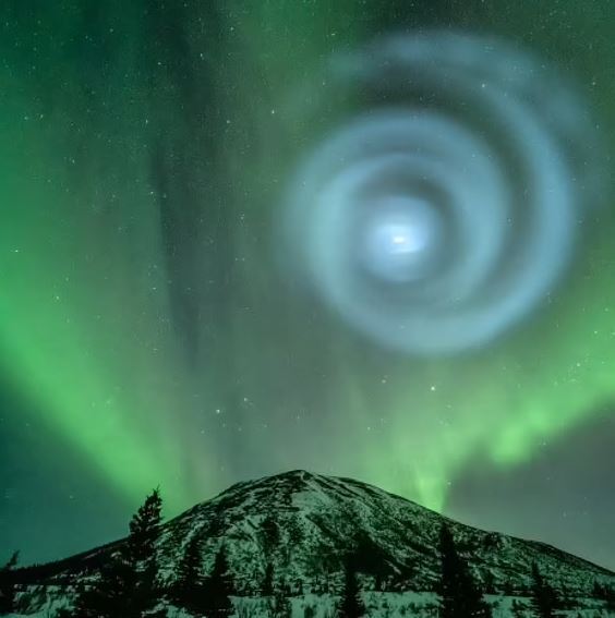 Рано утром в субботу, 15 апреля, жители Аляски могли насладиться довольно традиционным для этих мест, но от этого не менее красивым, зрелищем – северным сиянием. Все небо пронизывали ярко-зеленые всполохи. Однако обычное зрелище сменилось необычным – в небосводе появилась огромная бледно-голубая спираль.