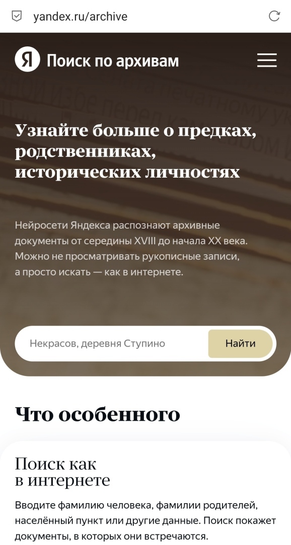 Нейросеть от яндекса (https://yandex.ru/archive) поможет нам узнать историю своей семьи. После получения запроса нейросеть распознает записи рукописных документов из Центрального госархива Подмосковья. Архивная база включает данные Московской области, Москвы, Тулы, Рязани и Владимира.