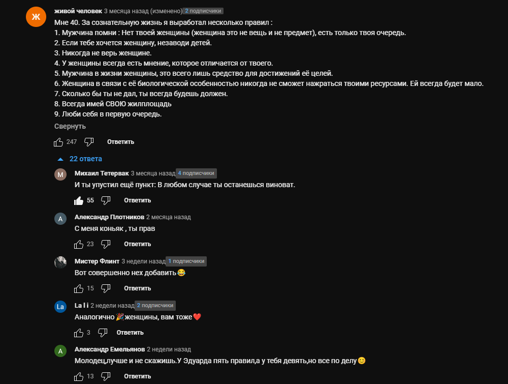 Часто, женщины начитавшись статьей, различных психологов решают, что их муж жуткий абьюзер или токс или нартс, как сейчас любят эти названия применять, вообще где только можно. Вот, они решают, что этот муж им всю жизнь испортил, все беды только от этого мужа и начинают свою жизнь менять с того, что выгоняют этого своего мужа.