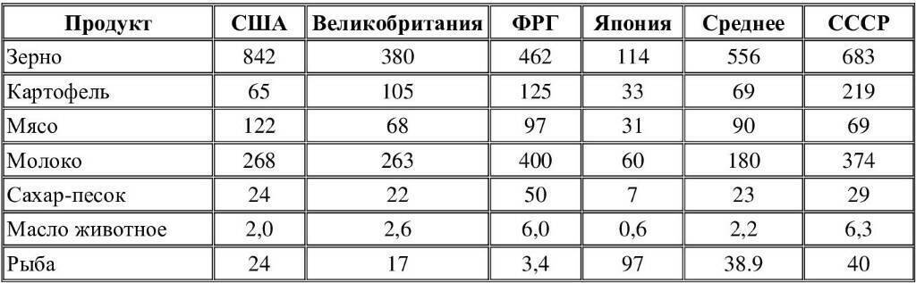 Тем не менее, колхозное сельское хозяйство СССР со своих скудных земель обеспечивало граждан СССР лучше, чем США, Германия, Великобритания и Япония в среднем обеспечивали своих граждан. Это видно из последних двух колонок таблицы. Только по мясу отставание, но правительство СССР не собиралось останавливаться на достигнутом. Это западные страны считали, что у них уже все хорошо с питанием, а в СССР так не считали и разработали «Продовольственную программу» – план по полному обеспечению всеми видами питания, – которую перестройщики не дали внедрить.