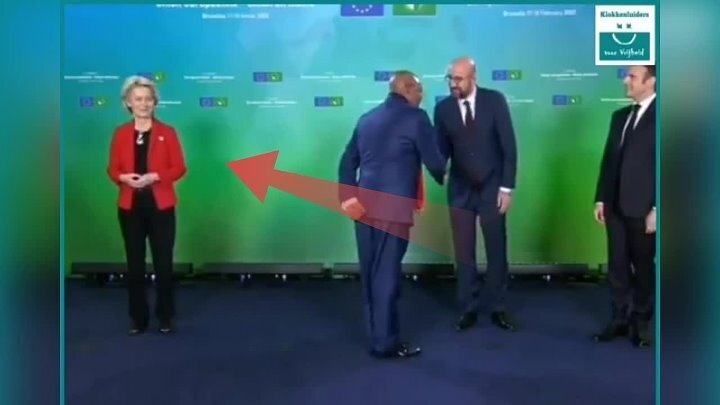 министр иностранных дел Уганды Джедже Одонго не заметив председателя Еврокомиссии проскочил мимо неё, при этом пожал руки президенту Франции Макрону и главе Евросовета Шарлю Мишелю, и немного обмолвился с ними.