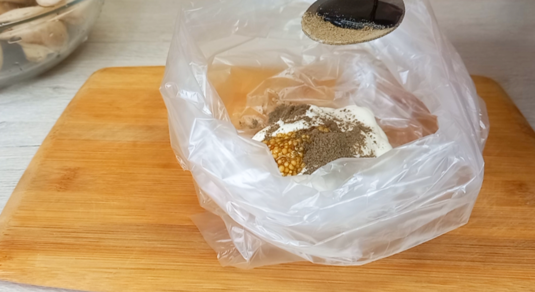 Теперь складываем грибочки в соус и хорошо перемешиваем. Заранее грибы хорошо моем и сушим.