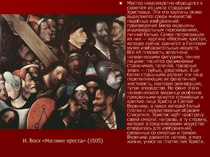 На этом полотне изображен Христос, восстающий из гроба. Лирический фон и мягкость цветов немного сглаживают драматизм сцены. Центром картины становится взгляд Иисуса, направленный на зрителя.