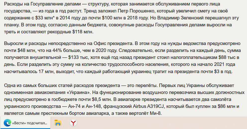 "... на содержание главы государства в прошлом году (2021) было выделено 15,945 миллиарда рублей. То есть в день на содержание Путина тратится 43,5 миллиона рублей! В этом году (2022) выделено уже 15,969 миллиарда рублей. Для сравнения, годовой бюджет Омска на 2018 год — 15 млрд, бюджет Воронежа — 16 млрд, бюджет Волгограда — 18 млрд рублей. Об этом сообщает "Рамблер". Далее: news.rambler.ru