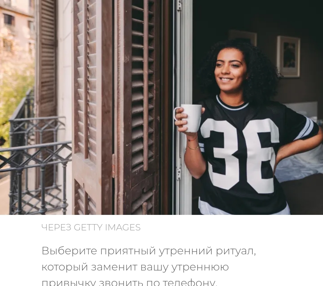 Когда вы начинаете свой день со своего телефона,вы втягиваетесь в чужую повестку дня, читаете чужие запросы, новости и социальные сети, и это лишает вас возможности начать ваше утро с самих себя, вдали от шума мира.