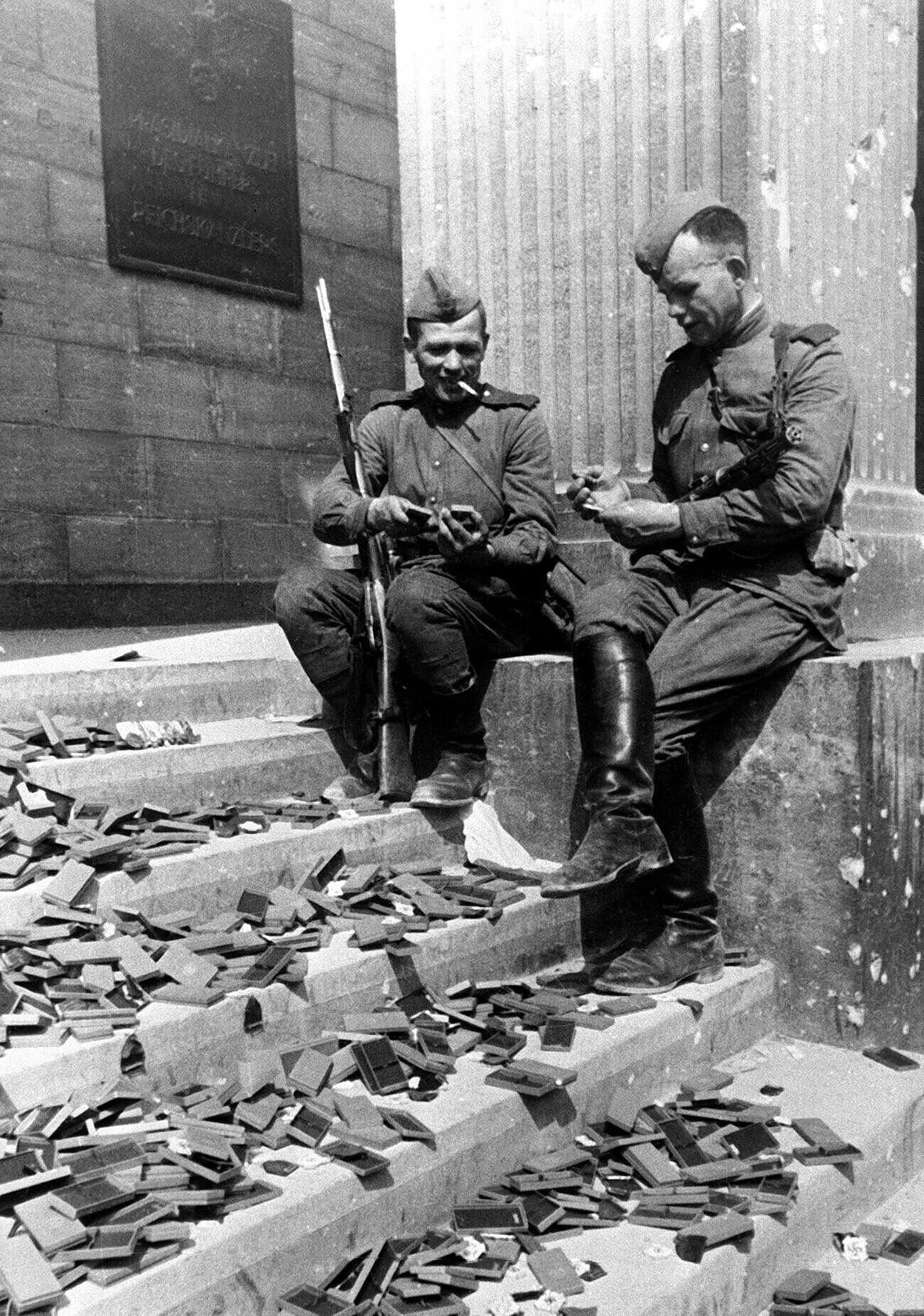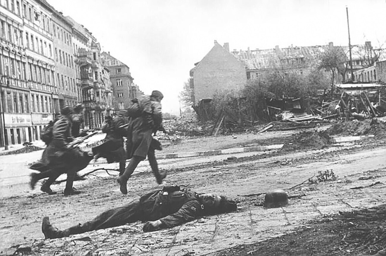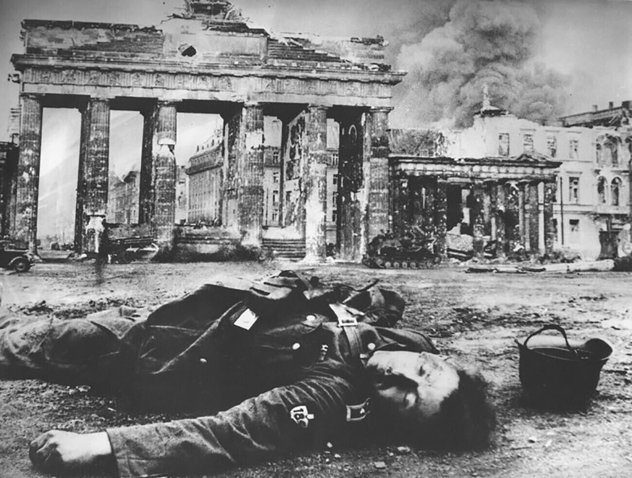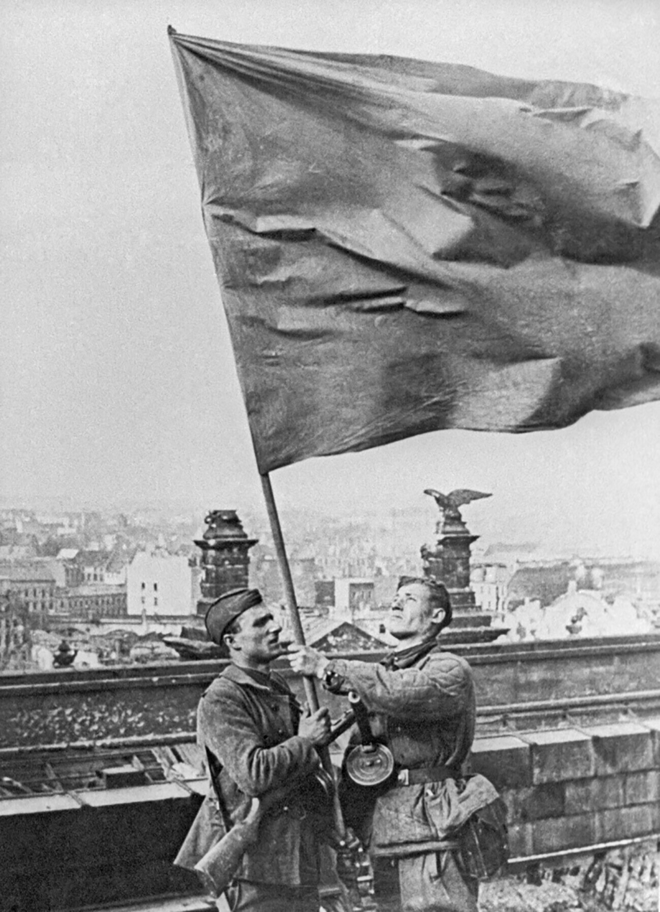 В день самоубийства Гитлера 30 апреля немецкий гарнизон был разделен на несколько изолированных групп и начались ожесточенные бои за здание рейхстага. Советские 152-мм гаубицы и могучие 203-мм гаубицы, прозванные ‘сталинскими кувалдами’, обстреляли здание в упор. Вечером того же дня солдатам Красной Армии удалось водрузить на крыше первое красное боевое знамя.