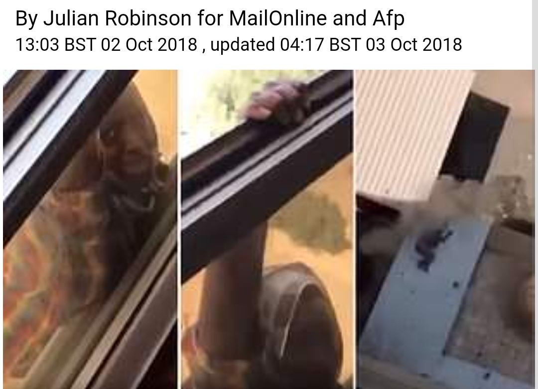 Видно, как испуганная горничная кричит "Держите меня, держите меня", как раз перед тем, как ее рука соскользнула, и она упала, ударившись о тент, который, по-видимому, смягчает удар.