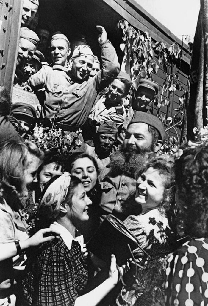 Встреча советских воинов-победителей на Белорусском вокзале в Москве.