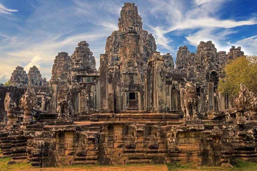 В Камбодже мы можем найти ещё один удивительный памятник, обработанный из красного камня - Храм Байон. Этот храм известен своими каменными башенками, которые украшены лицами и сохранившимися многочисленными рельефами, так же изображающими лица. Это место будет интересно для путешественников, которые хотят узнать о жизни и искусстве Древнего Камбоджи.
