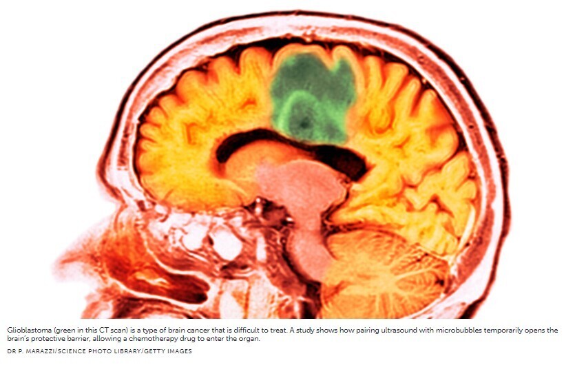 Теперь ученые могут доставить в мозг человека мощный химиотерапевтический препарат, временно открыв его защитный экран с помощью ультразвука и крошечных пузырьков. Клинические испытания на ранней стадии, описанные 2 мая в журнале Lancet Oncology, могут привести к появлению новых методов лечения больных раком мозга.