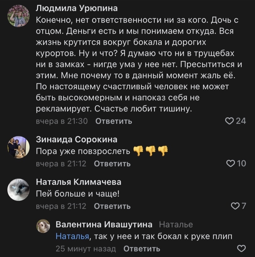 Что можно сказать в ответ на ее видео, когда она козыряет своими возможностями быть на Мальдивах, пить крепкие напитки и ухаживать за фигурой?