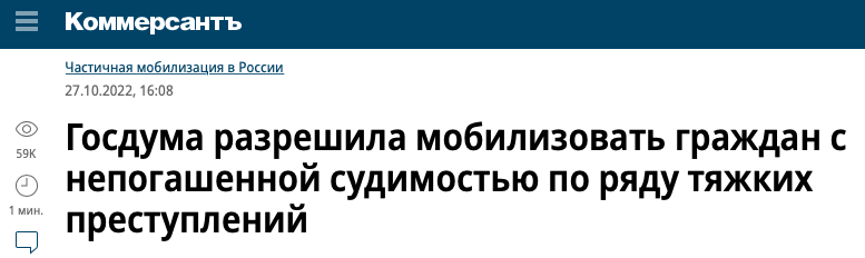 Решение Госдумы России о возможности мобилизации россиян с непогашенной судимостью по ряду тяжких преступлений.