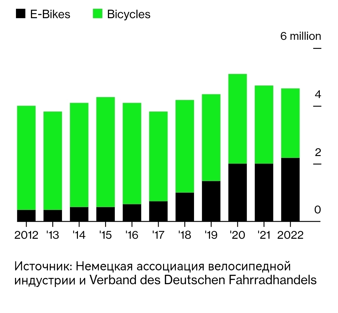Хотя бум электронных велосипедов не привел к значительному увеличению общего количества проданных велосипедов, их более высокая средняя цена означает, что из рук в руки переходит больше денег. За последнее десятилетие выручка выросла более чем втрое - до 7,4 миллиарда евро в прошлом году.