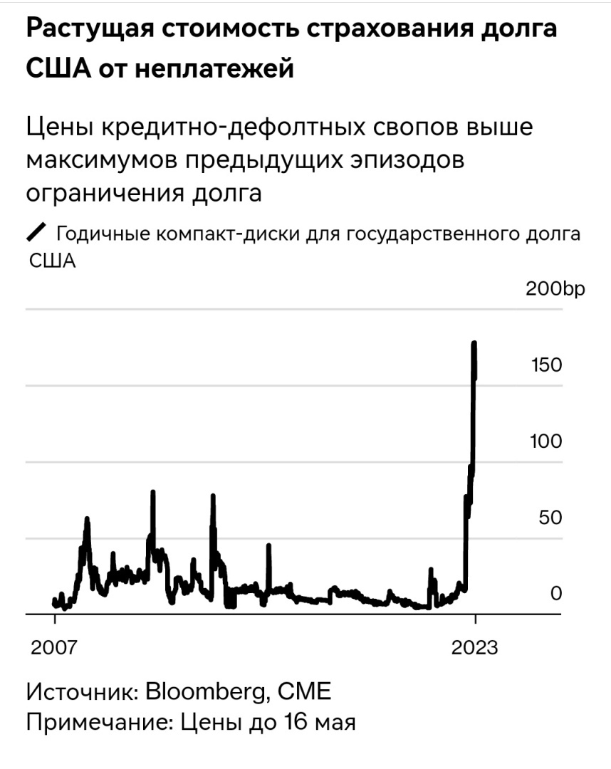 Помимо ГКО, еще одна ключевая область, на которую следует обратить внимание для получения информации о рисках, связанных с предельным уровнем долга, - это то, что происходит в кредитно-дефолтные свопы для правительства США. Эти инструменты выступают в качестве страховки для инвесторов на случай неплатежей. Стоимость страхования долга США сейчас выше, чем облигаций — среди прочих — Греции, Мексики и Бразилии, которые неоднократно объявляли дефолт и имеют кредитные рейтинги на много ступеней ниже, чем у США.