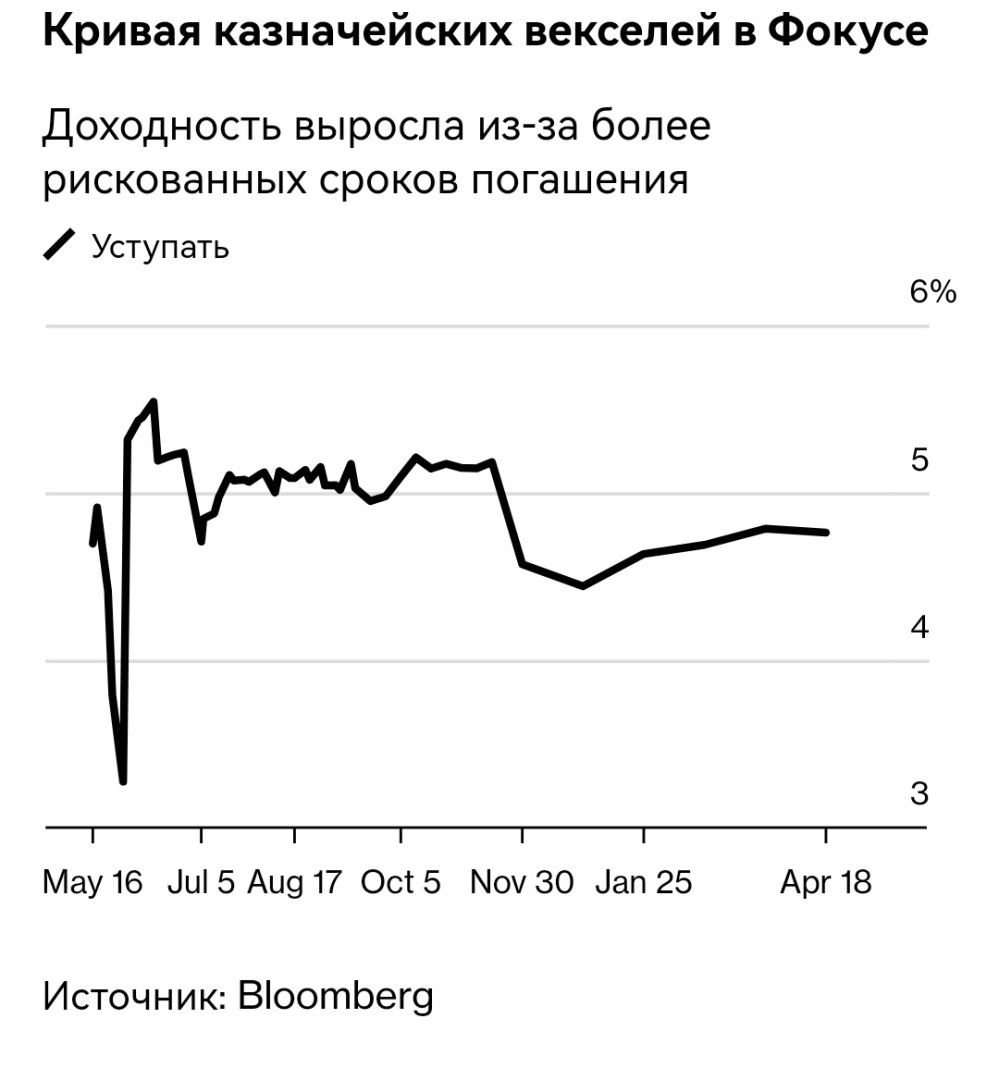 Инвесторы исторически требовали более высокой доходности по ценным бумагам, которые должны быть погашены вскоре после того, как в США, как считается, исчерпаются возможности по займам. Это уделяет большое внимание кривая доходности векселей — казначейских ценных бумаг с самым коротким сроком погашения — и любые обнаруживающиеся отклонения. Заметные восходящие искажения в определенных частях кривой, как правило, указывают на повышенную обеспокоенность инвесторов тем, что именно в это время дяде Сэму может грозить дефолт. Прямо сейчас это наиболее заметно примерно в начале июня. Казначейство в среду продало 17-недельные векселя на 39 миллиардов долларов под 5,10%. Аукцион оказался на 3 миллиарда долларов больше, чем на предыдущей неделе.