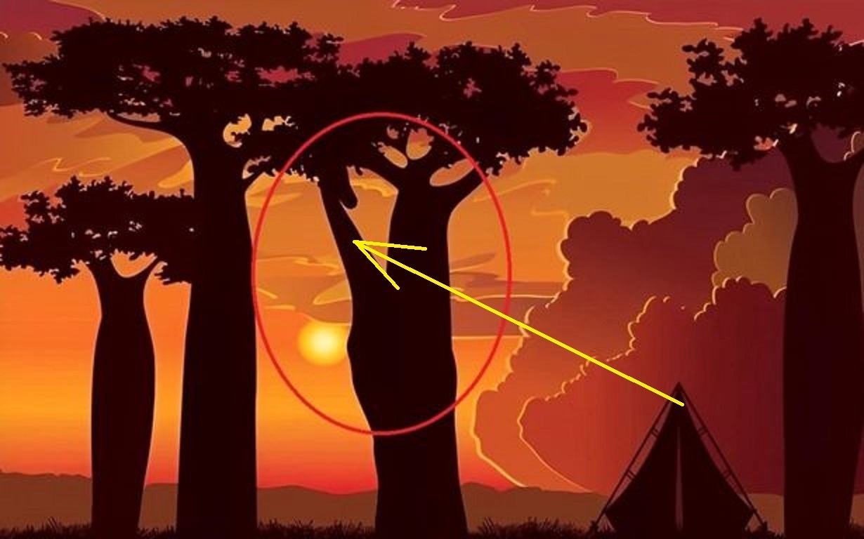 Жираф был спрятан рядом с деревом прямо в центре фотографии, а благодаря тому, что изображение выполнено в виде силуэта, он прекрасно сочетается со стволом и ветвями, поэтому его легко не заметить.