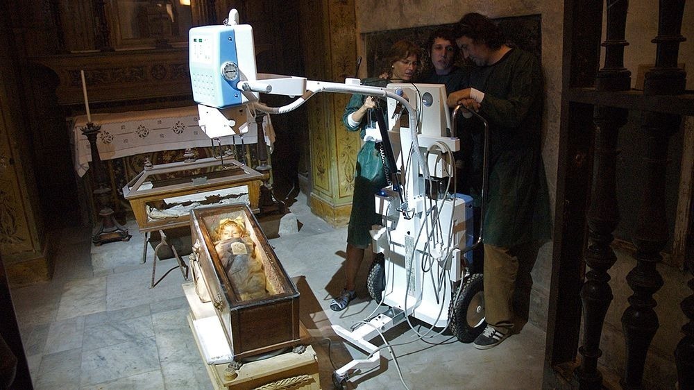 Группа исследователей проводит рентгеновское обследование тела Розалии.