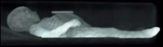 Рентгеновский снимок Розалии, показывающий, что ее мозг и печень целы. Решетка гроба под телом.