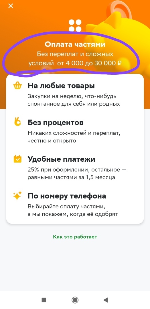 Более того, для того, чтобы воспользоваться предложением оплаты частями, необходимо совершить покупку на большую сумму. То есть не макрошек на 50 рублей купить.