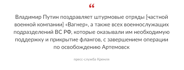 Пригожин заявил, что ЧВК "Вагнер" с 25 мая начнёт выводить свои подразделения из города на отдых и переподготовку. До этого будут созданы оборонительные рубежи, а сам Артёмовск будет передан армии России. Вернутся "музыканты" в случае, если России снова потребуется помощь.