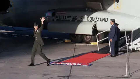 Когда это произошло, он был в образе будущего опального президента США и самолета, изначально предназначенного для сброса ядерных бомб на Советский Союз: B-52.