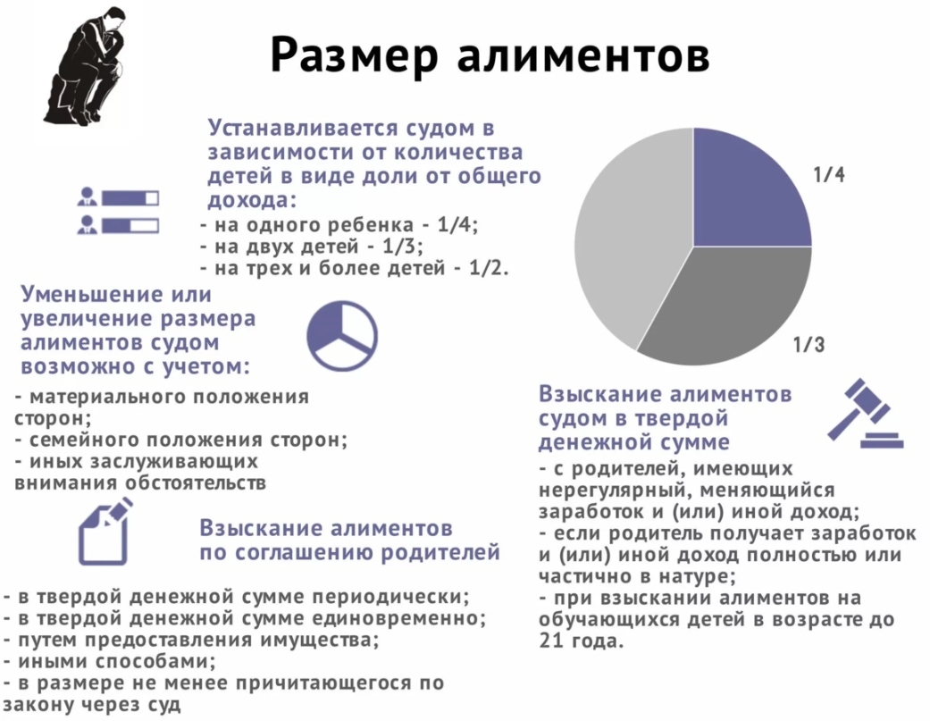 Максимальный размер алиментов не может превышать 70% от заработка. Официально в России установлено, что работник не может получать зарплату ниже МРОТ. Если несколько детей, то сумма на одного, составит 1/4 дохода, двоих - 1/3 дохода, на троих и более - половина дохода.