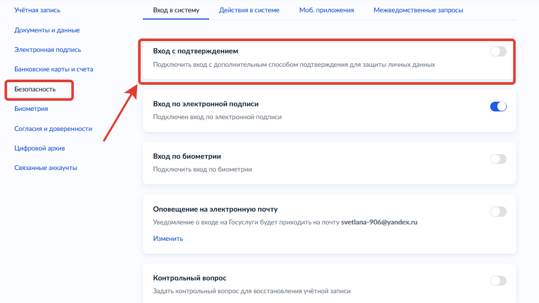 2. Включите опцию «Вход с подтверждением» — «По биометрии».