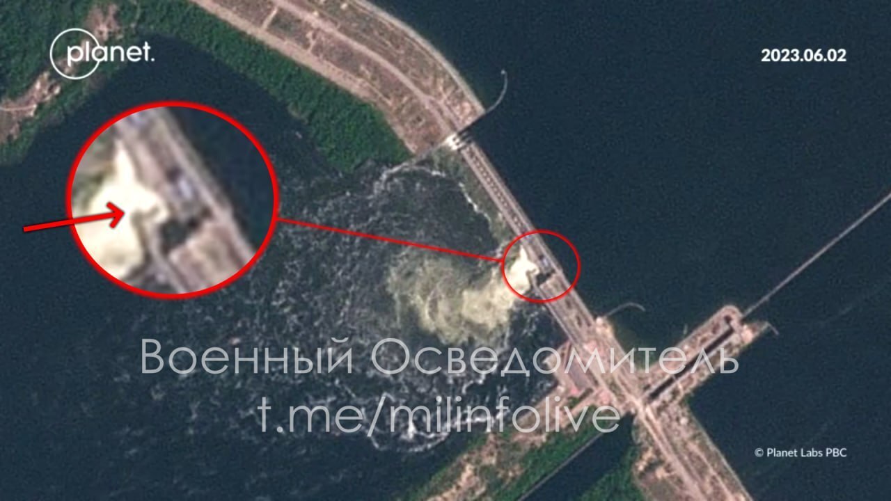❗️Судя по спутниковым снимкам, структурные разрушения на плотине Каховской ГЭС начались еще несколько дней назад.