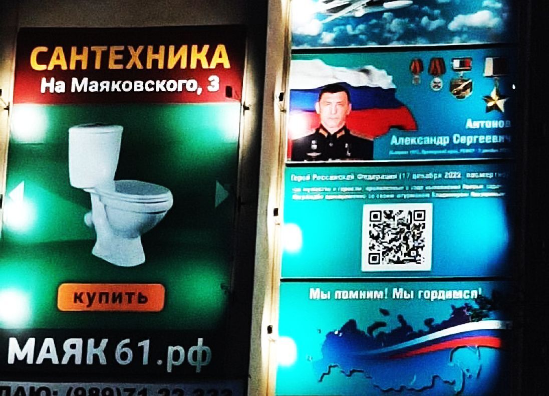 Коммерческое глумление: рекламу огромного унитаза вывесили рядом с портретом Героя России, погибшего под Бахмутом