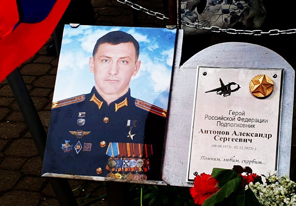 А на портрете изображён боевой лётчик Александр Антонов, который в 2022 году ушёл добровольцем на СВО и повторил подвиг легендарного Николая Гастелло, направив свой подбитый самолёт в колонну бронетанковой техники ВСУ. Антонов выполнил своё боевое задание, остановил продвижение врага и погиб сам. Александру Сергеевичу было посмертно присвоено звание Героя России. В Волгодонске Герою установлен памятный мемориал.