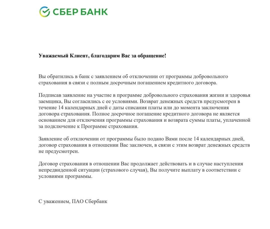 Получаю ответ от Сбера: фигвам, страховка продолжает действовать, досрочное погашение не является поводом для расторжения договора.