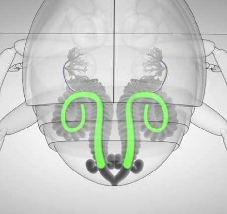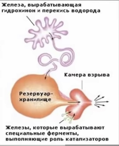 Получается его организм можно сравнить с химической лабораторией, а начало процесса идет с гланд, где образуются два химических элемента. От них идут два канала и попадают в большой внутренний резервуар - который выполняет функцию хранилища всех вырабатываемых химических элементов: